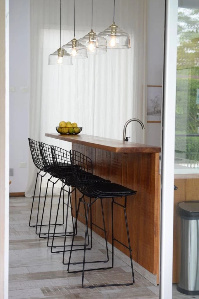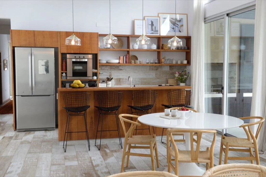 La cocina integrada suma una isla con mesada de Dekton de un lado y desayunador más alto en el otro, acompañado de cuatro banquetas Bertoia en color negro. El resto del amoblamiento se resolvió en petiribí, con alzadas de porcelanato Portobello (SBG). Una mesa Tulip y sillas Wishbone forman el comedor de diario.