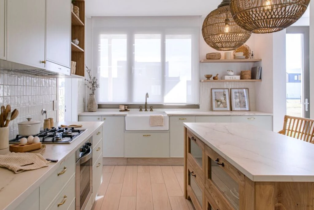 Aires románticos y notas campestres conviven en esta cocina, absolutamente cálida y luminosa. Separada e integrada al resto de la casa a través del jardín interno -y conectada con el mudroom y el lavadero- tiene muebles en MDF laqueados en un color verde muy clarito, con molduras finas (@dwellcocinas), que se combinan con estantes y nichos en color madera fabricados en melamina nature Camellia (@faplacmelamina) .