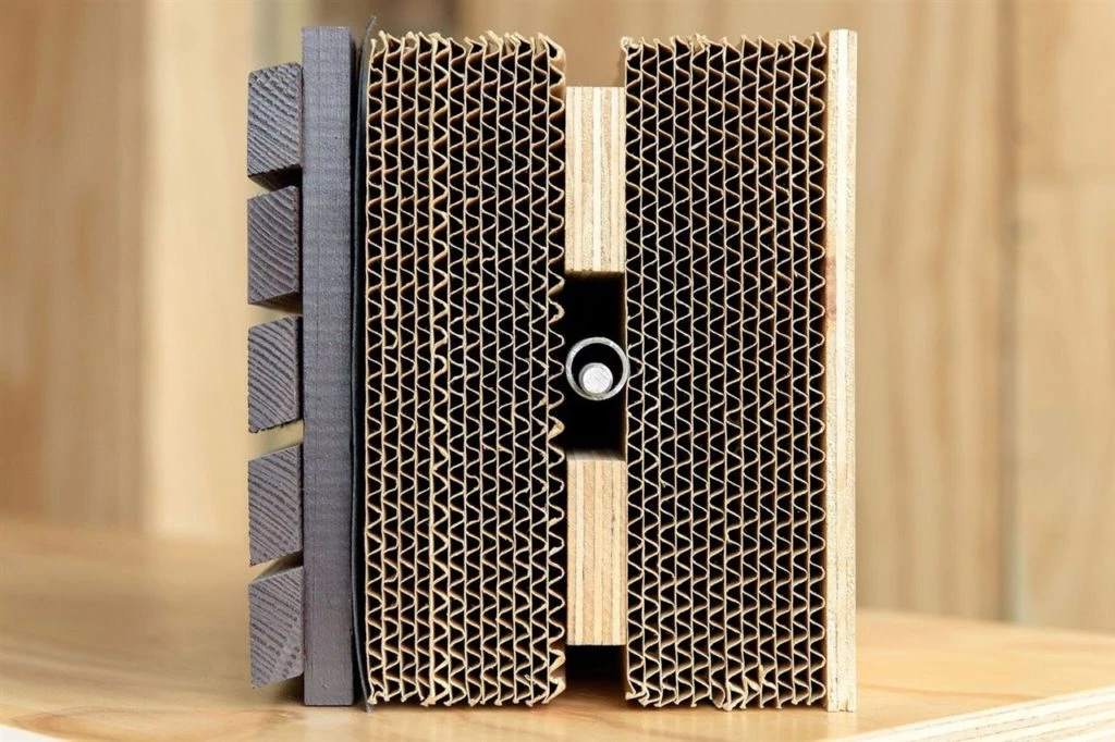 Todo el proceso de fabricación es sostenible, ya que cada capa de cartón está adherida con un pegamento ecológico y la superposición permite crear un gran aislamiento termo acústico.
