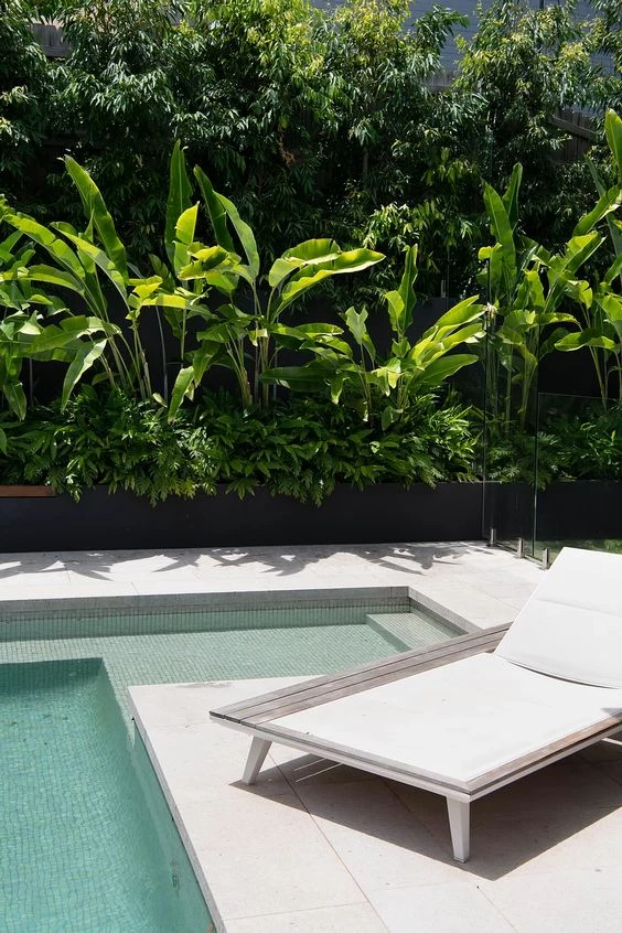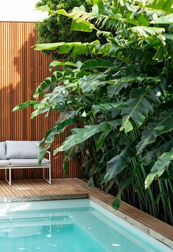 - Strelitzia nicolai: una de las plantas de moda que se puede cultivar al borde de la pileta. Necesita un buen espacio para poder crecer y desarrollarse cómodamente. Se recomienda evitar colocarla en lugares que reciban sol directo. Sus riegos deben ser moderados.