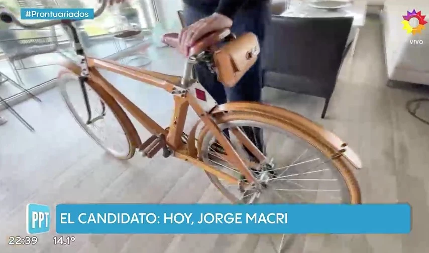 En el día de ayer, el candidato estuvo de invitado en el programa de Jorge Lanata y allí realizó un recorrido por su departamento de Barrio Parque donde convive con María Belén Ludueña. Pero uno de los objetos que más llamó la atención en su casa fue una bicicleta de madera realizada en pinotea que la tiene sólo como objeto de deco para dividir el living del comedor.