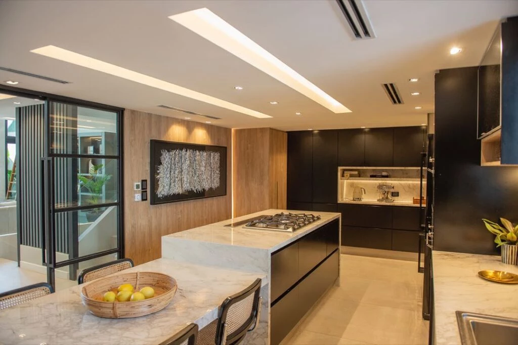 La cocina sorprende por su diseño vanguardista, con una gran isla central revestida en Dexton Bergen que se continúa en forma de mesa para comedor de diario, junto a sillas de diseño moderno (Manifesto).