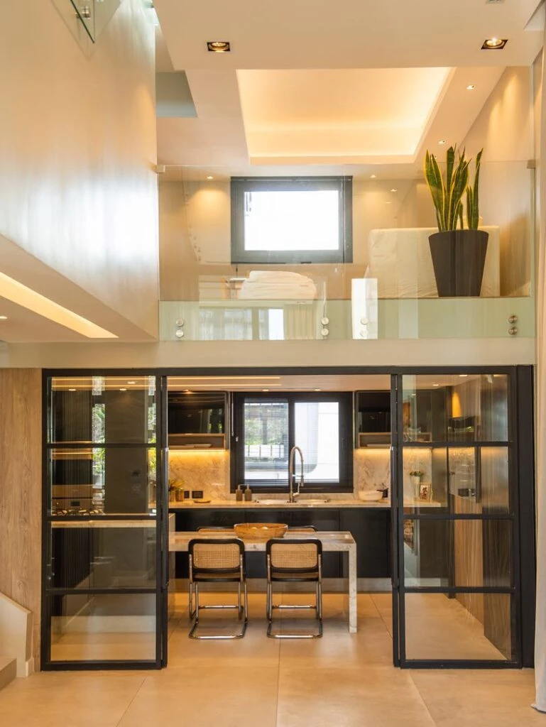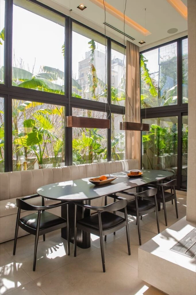Junto a los ventanales de doble altura y de cara a un jardín envolvente como fondo (paisajismo de Bio Verde) se armó un comedor que propone una mesa con tapa de Dekton (Eurostone) y sillas en madera oscura (Quintana Casa) con unas modernas lámparas colgantes (La Feliz).