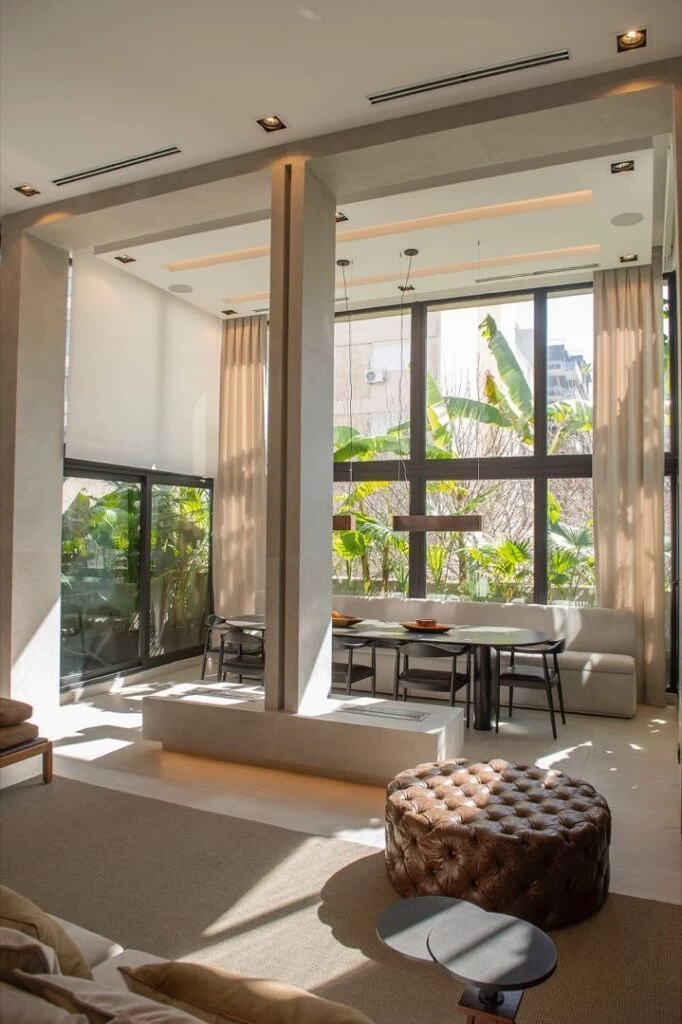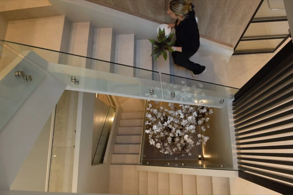 Las escaleras que conectan a los cuatro pisos se renovaron con barandas de vidrio DVH y se remató toda la columna con una gran lucarna central que las baña por completo de luz. Desde la planta baja, y en el corazón del conjunto, trepa un árbol de cerezo japonés, con tronco de hierro y flores de cerámica. En la última planta se armó un oasis verde, con plantas selváticas de interiores.