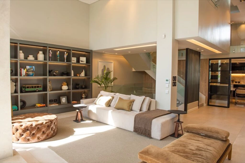 En living ofrece un sillón tapizado (diseño exclusivo del Estudio Palombo) con almohadones reversibles (La Buhardilla Decora) y una manta de pura llama tejida en telar (María Casanova Home). Una gran biblioteca central suma objetos y obras de arte varias (Quintana Casa, Soledad Rivarola y Ángeles Gollan). Todos los pisos de este sector son de porcelanato italiano de piedra natural con textura, en continuidad con el comedor y la cocina.