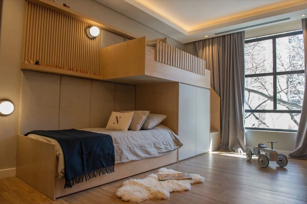 El dormitorio infantil es mágico, con un mural inspirado en la selva africana (Tinta Chini) junto a una gran biblioteca con juguetero y espacios de guardado para compartir. La arquitecta armó un diseño especial para las camas en dos niveles, ambas en madera enchapada en madera con acabado en decapé.