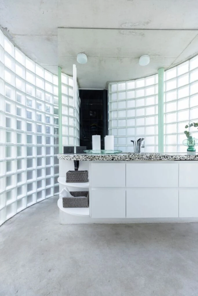 El baño principal es el único espacio que se encuentra por fuera de la grilla de columnas y al cual se accede y a través de una puerta del vestidor. Un pared curva de ladrillos de vidrio baña a este espacio de luz natural y transparenta el verde de la vegetación exterior, haciendo del baño toda una experiencia hedonista.