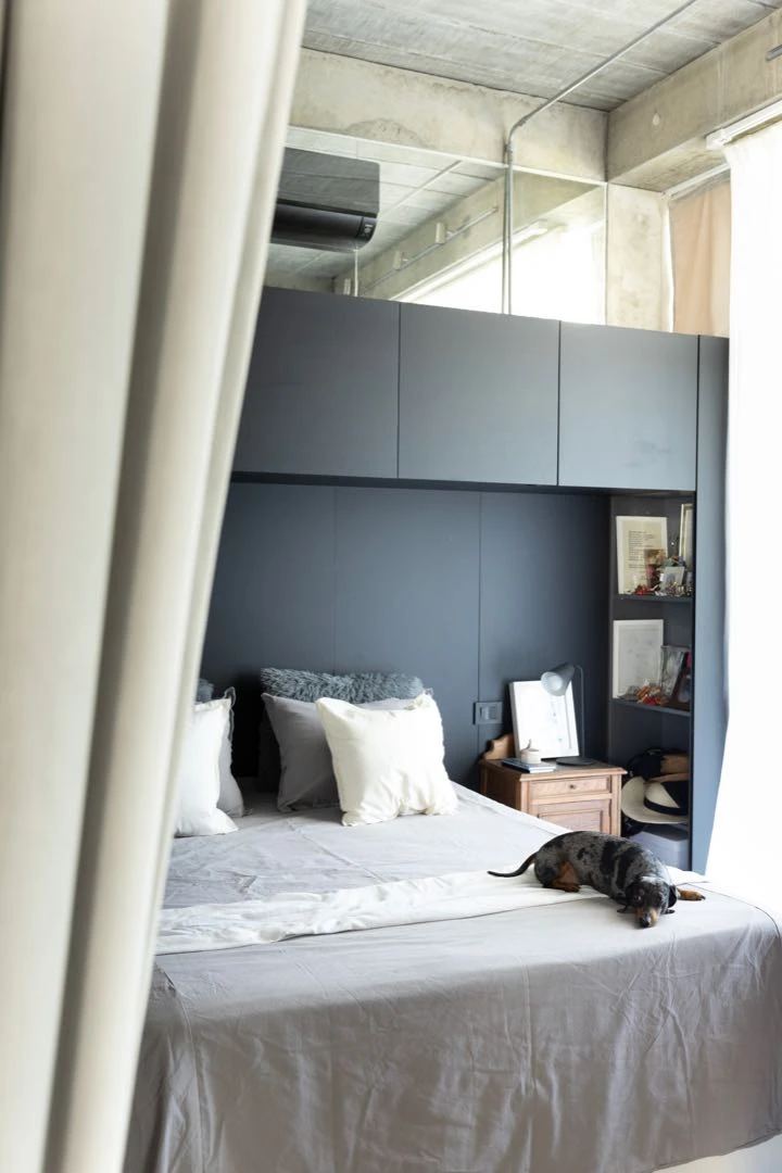 En su dormitorio, los muebles laterales ciegos resueltos con las mismas placas usadas en la cocina, esconden todo lo necesario para la vida diaria, pero también el acceso a la sala máquinas y al baño. Por encima de ellos, hacia el cielorraso de hormigón, una línea de espejos generan un efecto visual de continuidad, de modo tal que la casa parece expandirse en los cuatro sentidos, como una especie de truco perceptivo.