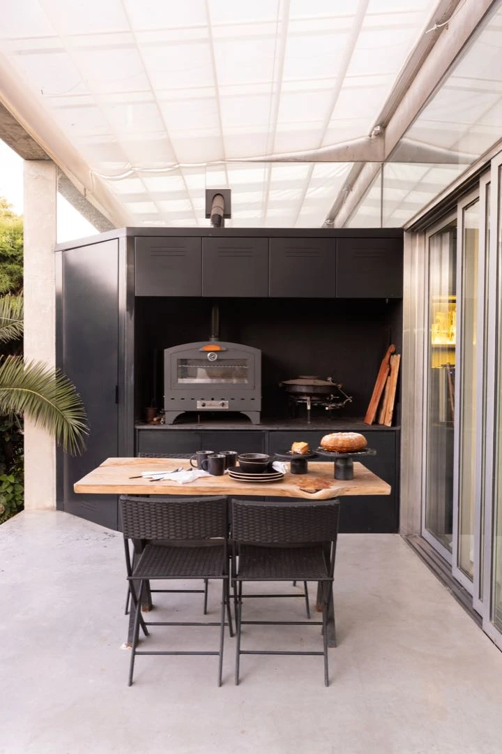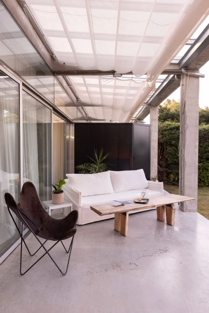 La casa posee dos galerías de iguales dimensiones pero con distintas atmósferas: una que mira hacia el patio seco de la entrada y otra de verano hacia el jardín, protegidas por un sistema de toldos romanos. En ella se armaron distintas situaciones: un sector de estar con un sillón de tres cuerpos enfundado en tussor, una larga mesa-banco de ciprés y un sillón BKF con pelo y un sector de fuegos con un horno Tromen a gas y un disco de arado junto a la mesa y las sillas (@casaeclectica).