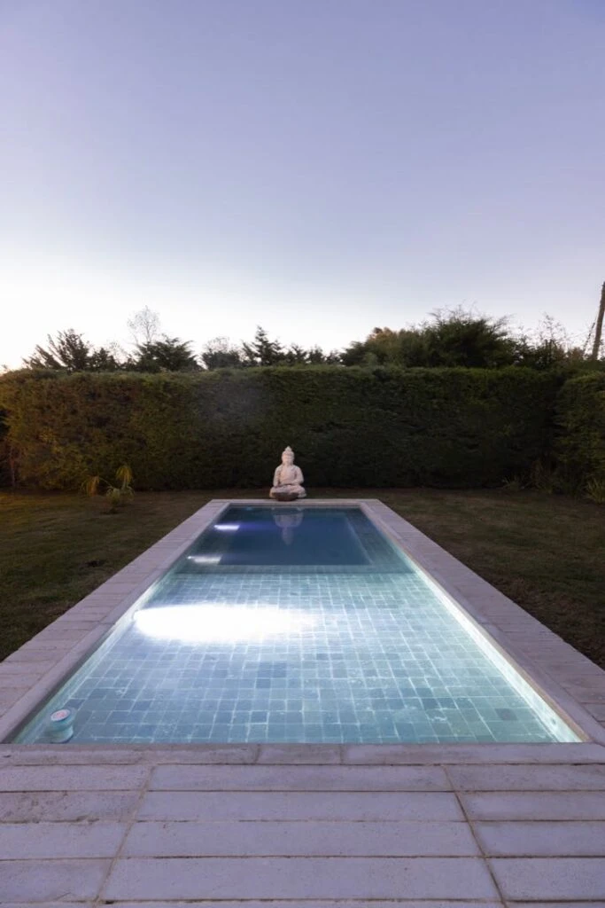 Una imagen de la casa desde el jardín de noche, con la saliente del baño vidriado a un costado. La pileta se pensó como un espacio de encuentro más, mide solo 3 x 5metros y posee un banco interior sumergido y una playa húmeda de 3,5 por 3,5 metros, solárium y un jacuzzi que se usa todo el año. "El Buda protege toda la casa, y amo el reflejo que genera sobre el agua”, cierra Gabriela.