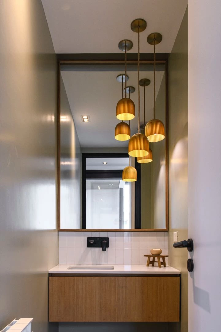 En el toilette original del departamento, el toque “chic” lo da un racimo de lámparas colgantes sobre el lateral del espejo como único elemento decorativo.