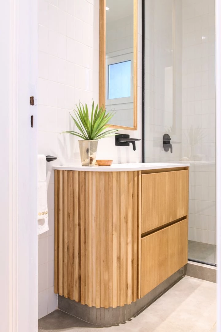 El baño principal es súper luminoso y en continuidad con el estilo del departamento. Tiene una mesada oval en mármol Total White Purastone (Italpiedra) en contraste con las griferías en color negro mate (FV) y un vanitory en madera de kiri con detalles varillados.