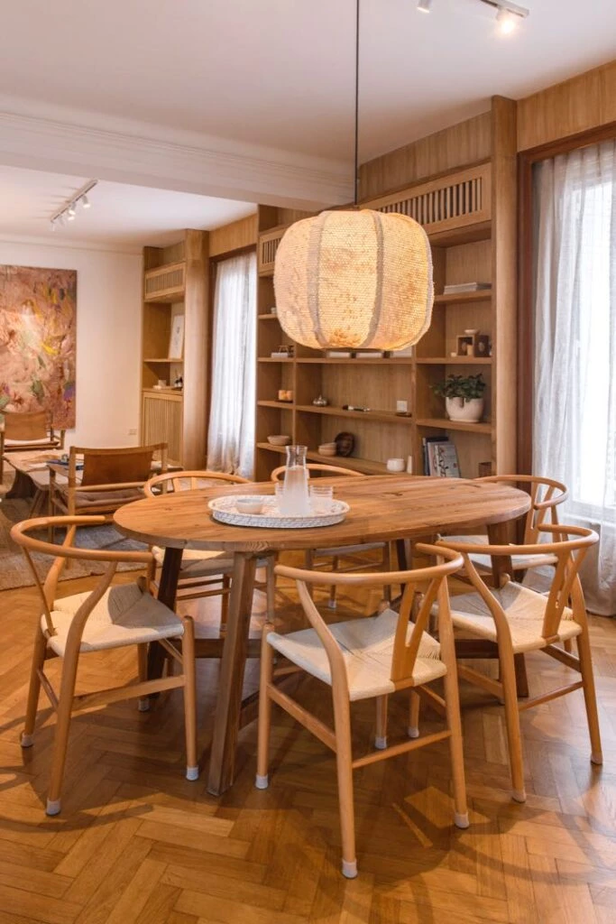 La biblioteca tiene un rol central en este living comedor, ya que ocupa todo el largo del espacio, escondiendo los equipos de aire acondicionado y envolviendo las ventanas existentes en fachada de manera orgánica. Diseñada en madera de kiri natural por ARQCH estudio, suma una cuidada selección de obras, como los cuadros de Sofi Gallo.