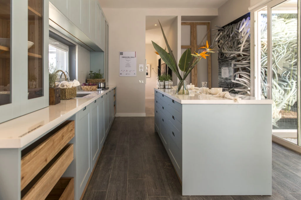 Ante un color celeste como protagonista -tendencia esta temporada y presente en los módulos tratados con poliuretano-, se optó por una mesada impoluta de Silestone Miami White (Canteras) y madera de paraíso para darle un cierre perfecto y terminar de engamar la paleta. Los tiradores modernos, los conceptos simétricos y las líneas simples, se adaptan a la perfección al estilo clásico que predomina en esta cocina.