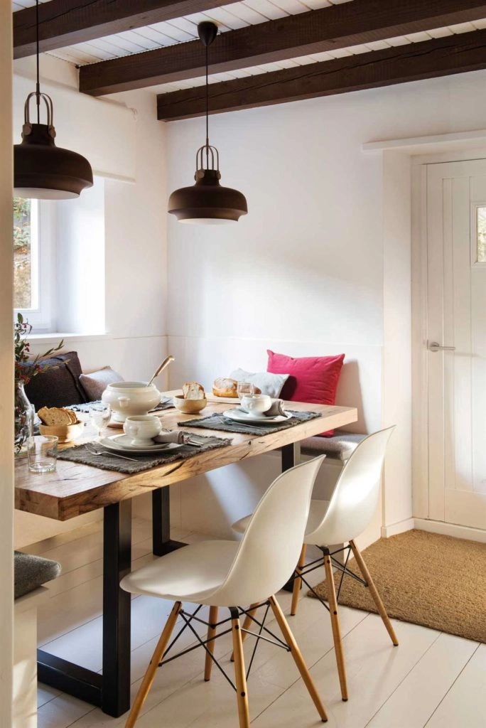 A diferencia del rústico tradicional en el que los tonos oscuros y terracota son los protagonistas, acá lo es el blanco. Le da un plus de modernidad y es un gran aliado para iluminar y ampliar visualmente los diferentes ambientes. Se aplica como base en paredes, techos, suelos y se combina con muebles de madera y textiles de colores neutros para iluminar el ambiente.