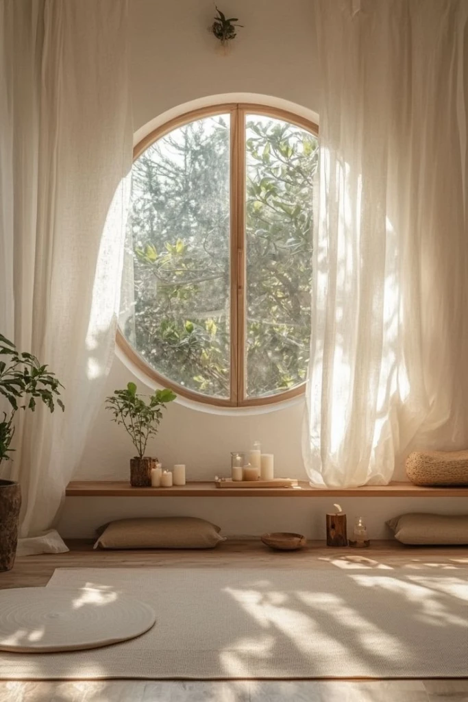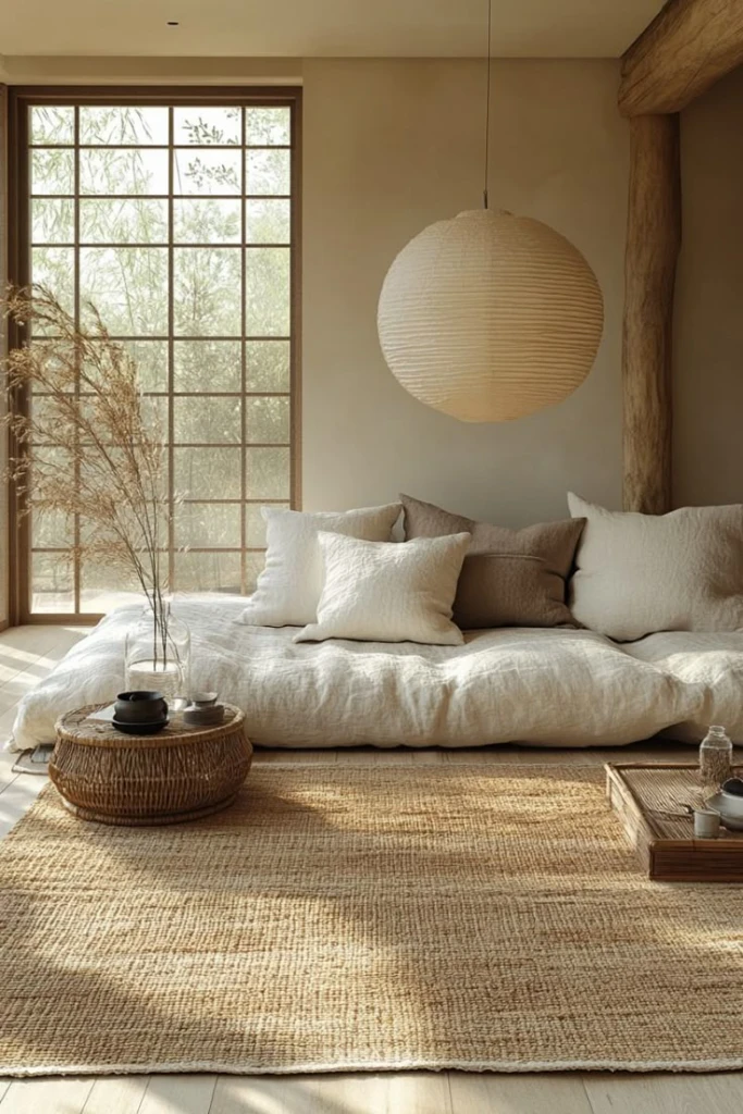 La iluminación es clave para lograr una atmósfera que genere bienestar. Las lámparas de papel, las velas y la luz cálida crean un ambiente acogedor y relajante.