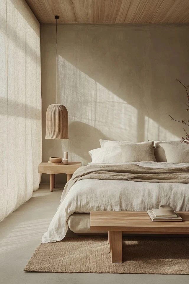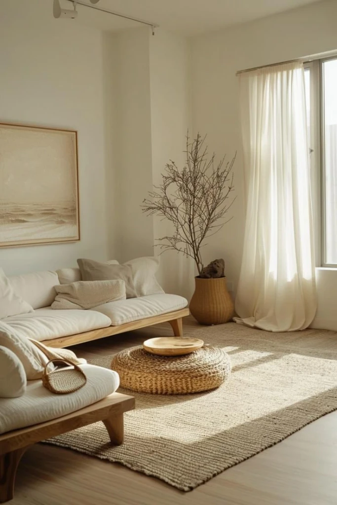 El yugen apuesta por una paleta de colores suaves y relajantes: blanco roto, beige, gris claro, tonos arena y verde oliva.
