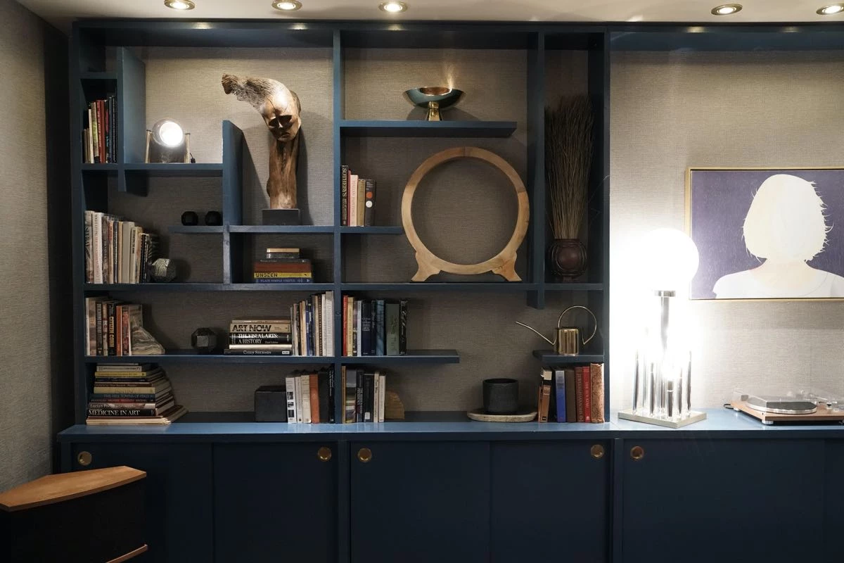 Y en el caso del depto de Charles (Steve Martin), así lo describe: “Es un diseño interior contemporáneo que se refleja en un espacio renovado, con tonalidades azules, grises y naranjas, además de patrones geométricos y el toque de arte moderno que expresa su educación y su complejo amor por los hechos históricos esotéricos.