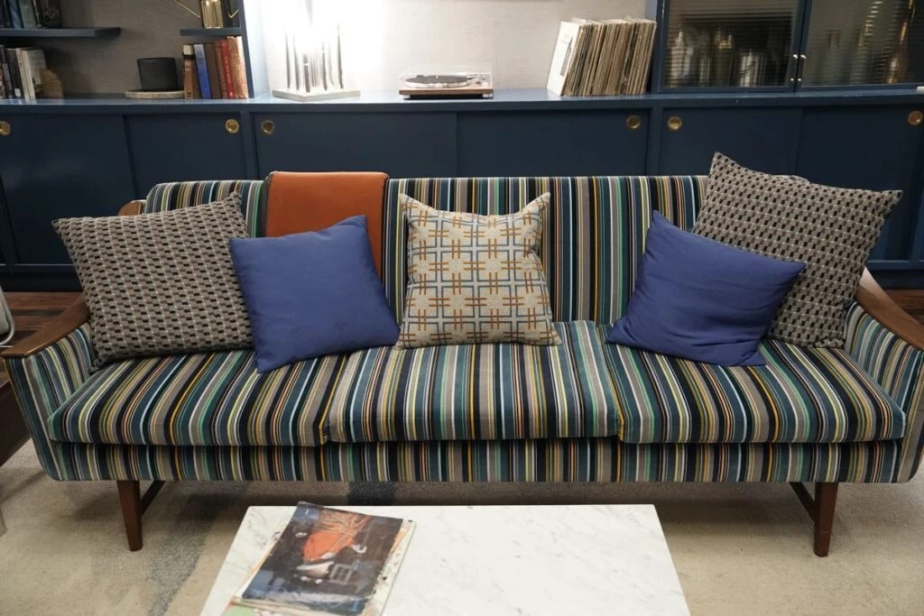 Y en el caso del depto de Charles (Steve Martin), así lo describe: “Es un diseño interior contemporáneo que se refleja en un espacio renovado, con tonalidades azules, grises y naranjas, además de patrones geométricos y el toque de arte moderno que expresa su educación y su complejo amor por los hechos históricos esotéricos.
