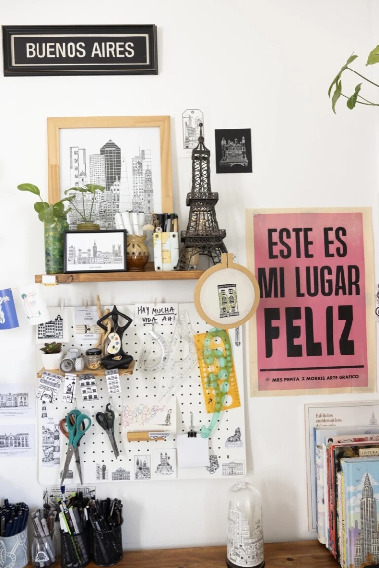 Como cuando hizo cursos y talleres y exploraba referencias por cuenta propia para empezar su camino de dibujante, ahora Mariel investiga mucho -muchísimo-, a veces saca fotos –mil fotos, desde distintos ángulos y detalles- y convoca y consulta a arquitectos, arquitectas y artistas ante cualquier duda o necesidad de otra mirada. “Esa red de acompañamiento es sumamente importante para seguir creciendo”, enfatiza en su estudio, su taller, su postal aquí y ahora.