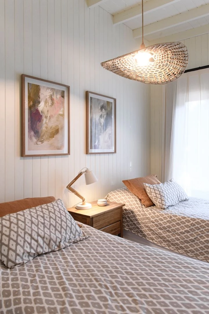 El machimbre pintado de blanco cubre la pared cabecera y le da una impronta de playa a este dormitorio con vista al bosque. Para mayor remate, destaca elcuadro Beach (@solpalou). La ropa de cama en colores neutros suma unos almohadones traídos de India, bordados con la técnica cutwork. Como mesas de luz, troncos de madera y lámparas colgantes de fibras naturales (@casaorilla).