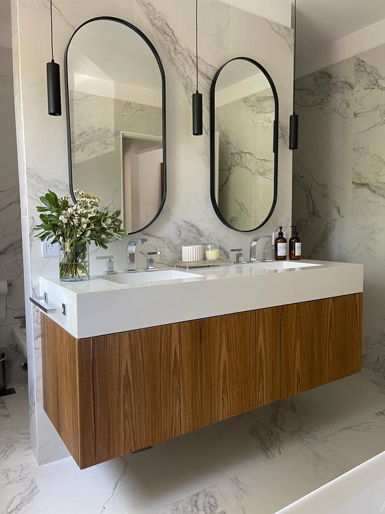 Y agrega: "también optamos por una mesada y bachas en silestone, mueble de guardado en petribrí, y detalles en negro como los espejos y las lámparas colgantes. Elegimos el mismo porcellanato de mármol para paredes y piso", detalla Lourdes.