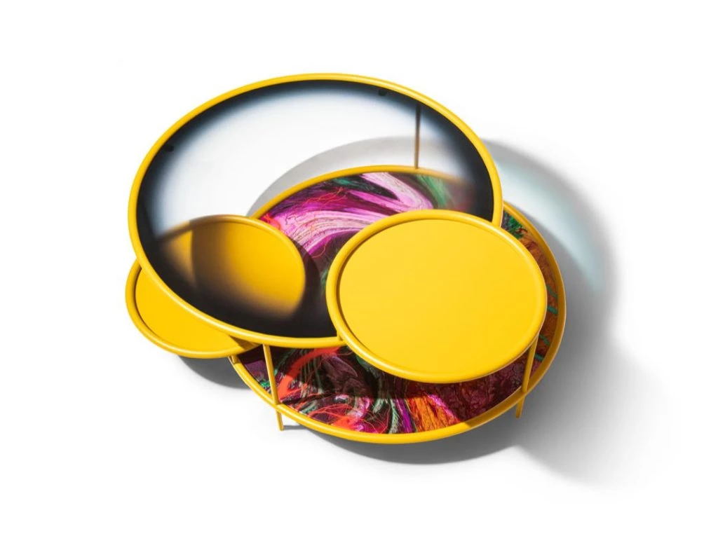 La firma Driade sorprendió con un diseño de tinte lúdico. La mesa Sangaku, creada por Elena Salmitraro, está inspirada en los Sangaku de la cultura japonesa (problemas geométricos grabados en tablas de madera). Su diseño reúne cuatro tableros circulares superpuestos entre sí (en 82 y 42 cm de diámetro) de los que se puede obtener un tamaño total de la mesa de 100 x 82 cm. y 41 cm.de altura. Viene en cuatro tonos y con imágenes multicolores impresas en el vidrio que le dan a un lenguaje contemporáneo lleno de energía.