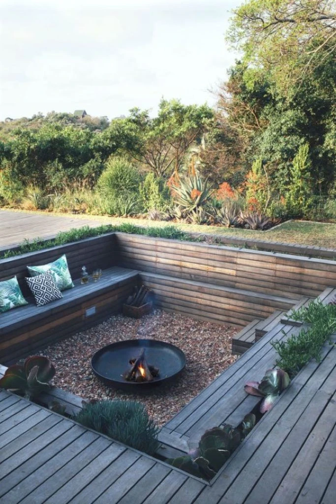 Un gran plato de hierro circular compone este fogonero de diseño simple, pero que ocupa el centro de un espacio pensado especialmente para su uso: montado sobre una base de piedras partidas, aparece escondido (uy protegido) por una estructura cerrada con gradas de deck de madera que le dan forma a los sillones y la escalera.