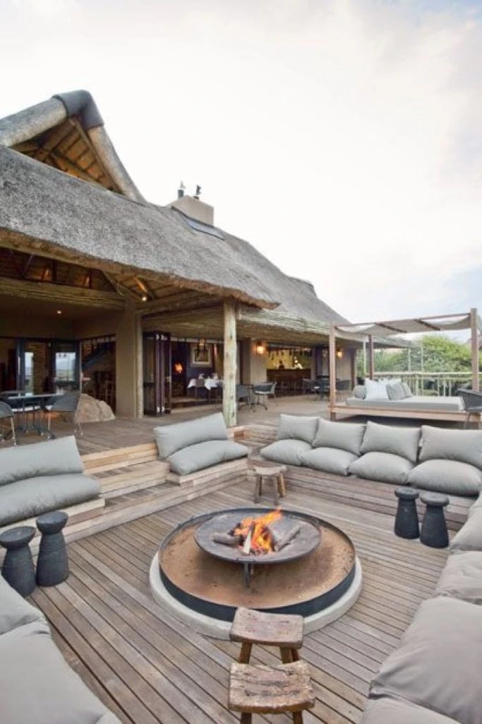 Un generoso deck en altura con diferentes espacios para el relax recibe a los huéspedes con un fogonero cuadrado de piedra y hormigón. En su interior, un recipiente con bioetanol garantiza fuego contínuo.