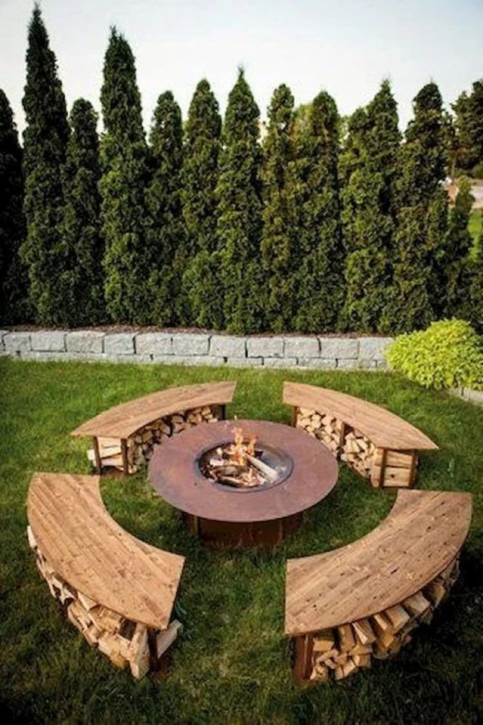 Otra opción de hierro óxido, esta vez con una base que le suma cierta altura. Lo rodean unos bancos en semicírculo muy originales, que esconden un leñero en su interior.