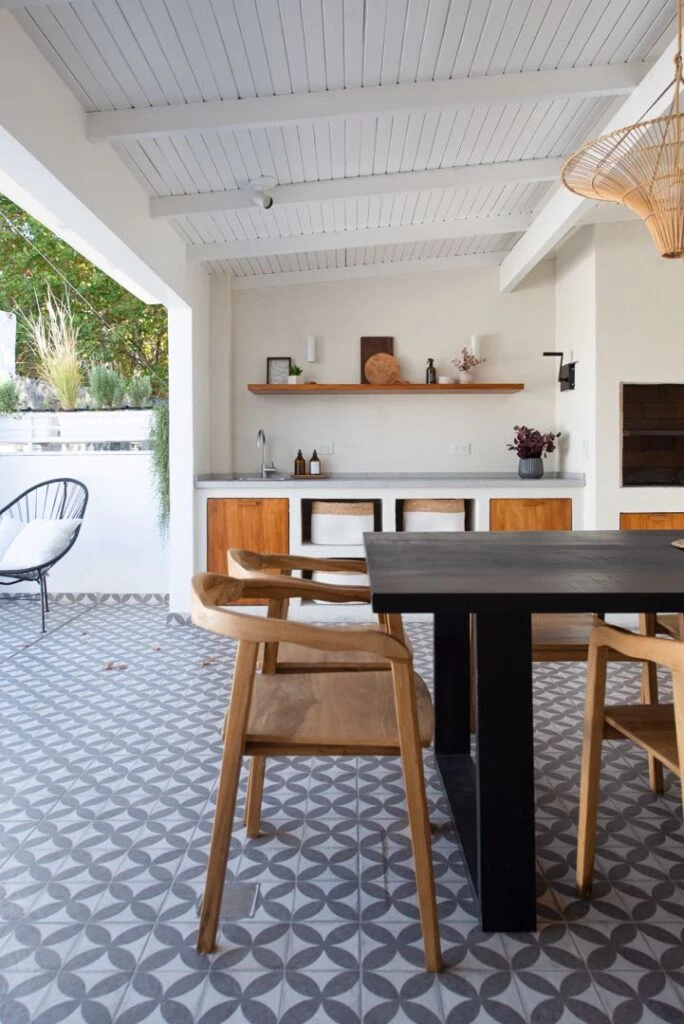 El exterior de esta casa de barrio reformada recientemente se resolvió con un área de quincho de estilo mediterráneo, con un bajomesada hecho de cemento al costado de la parrilla y mobiliario en madera. Al centro, un juego de mesa y sillas diseñadas por el estudio (realizadas por @iarteydeco). El piso lleva cerámicos Flower Black en 45 x 45 cm (San Lorenzo).