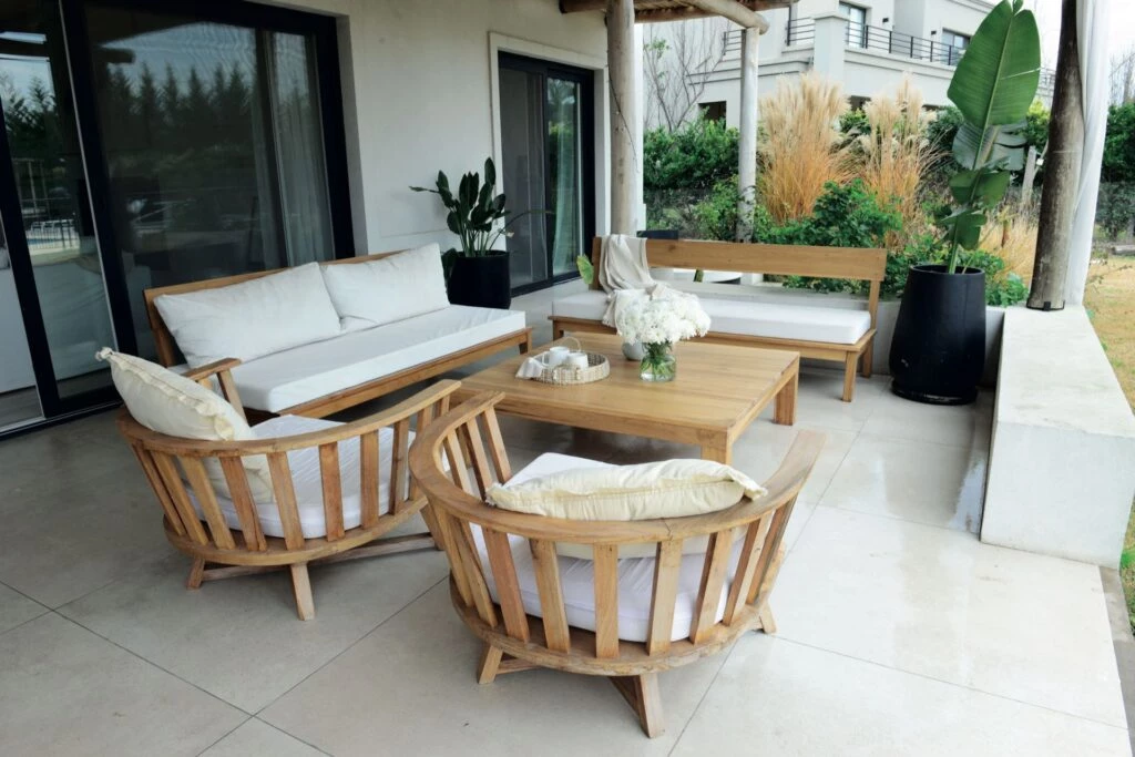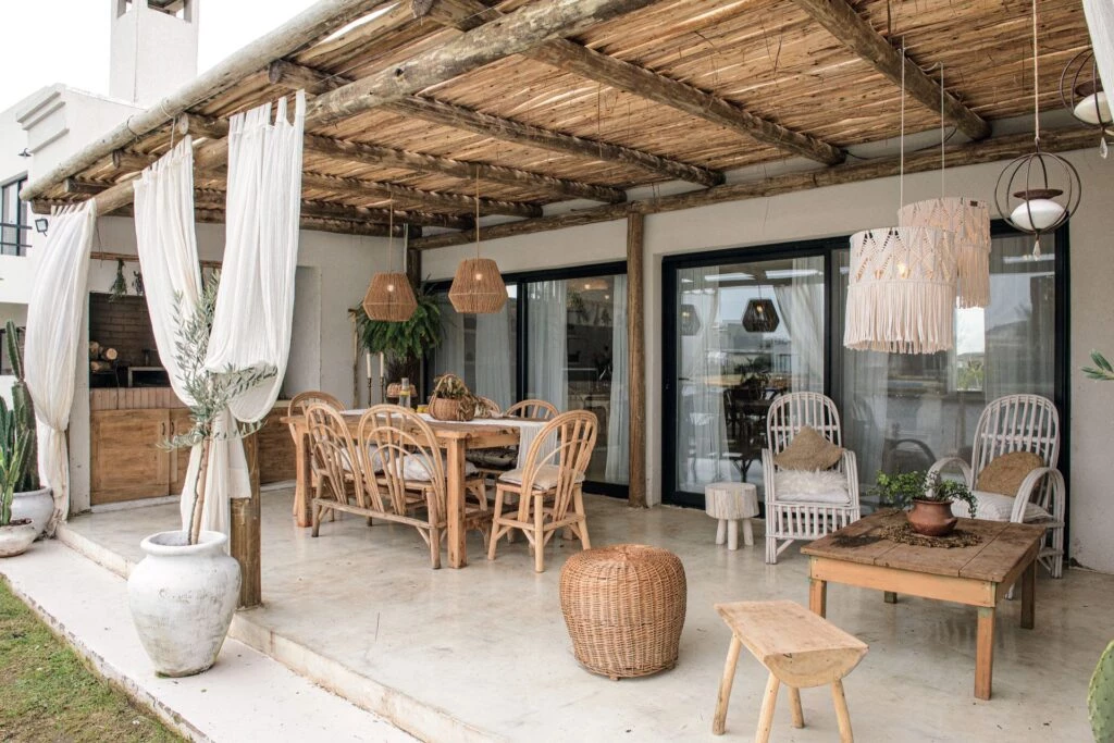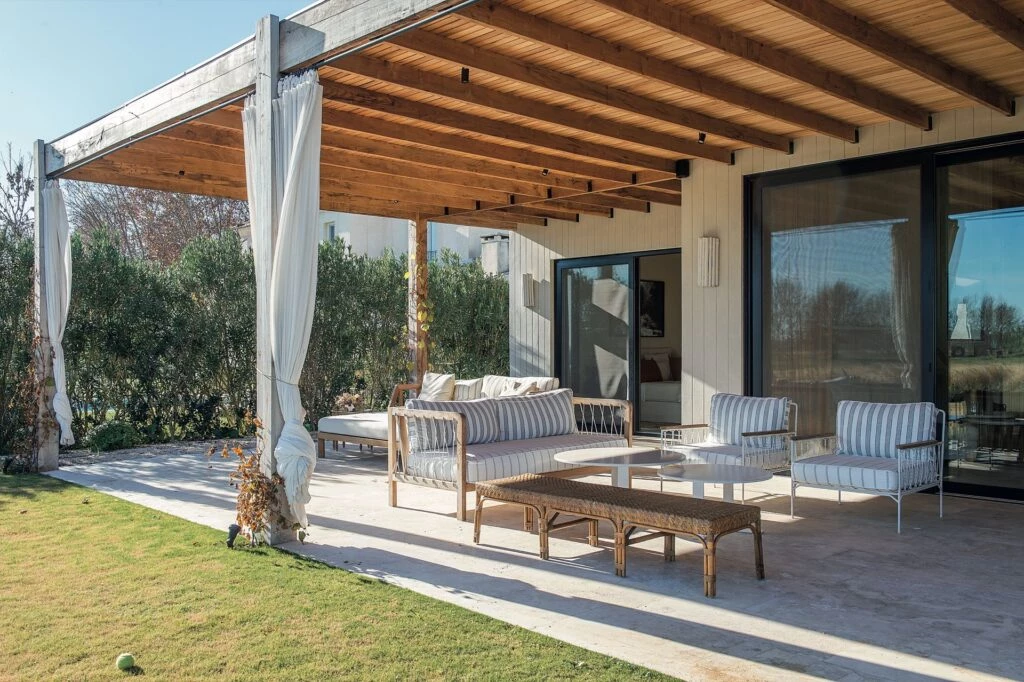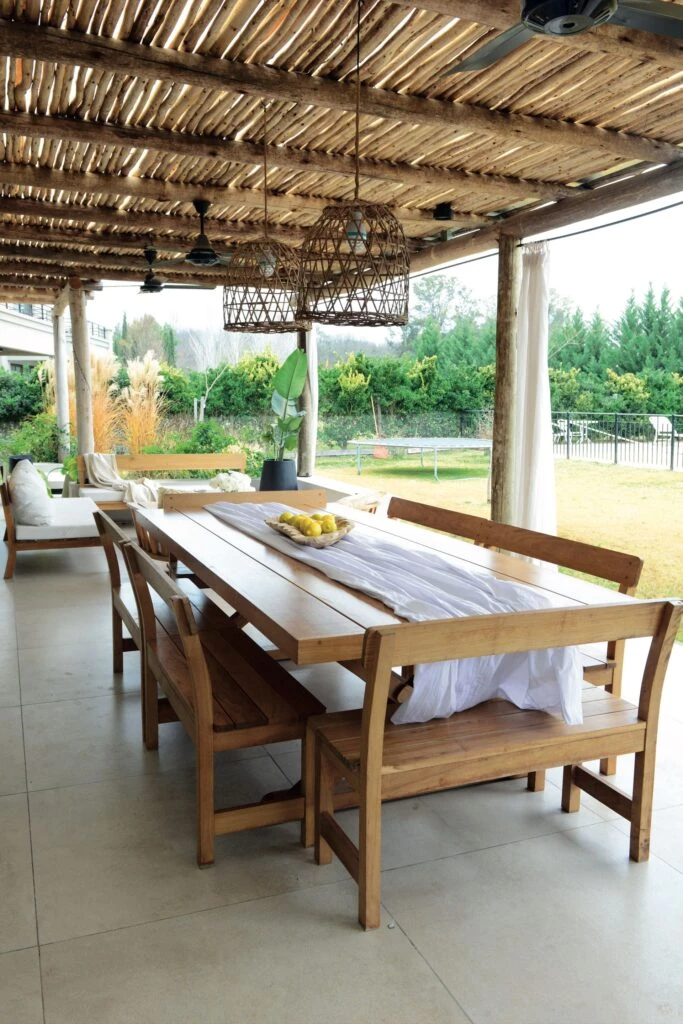 La galería de esta casa relajada sorprende con el techo rústico de eucaliptos. La mesa y los bancos son de petiribí, al igual que el juego de living (todos de El Cerne Muebles). Centros de mesa (@salazarcasa).