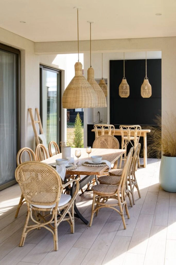 La galería de casa Bélgika propone un comedor de exteriores de cara al jardín y junto a la parrilla, resuelto con una mesa con base de hierro y tapa de madera maciza, lámparas colgantes y sillas de rattan (todo de @compañianativa).