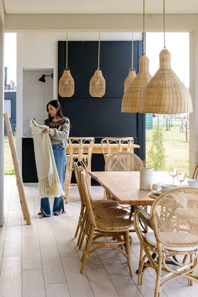 La acompañan unas sillas en palo de sauce con madera reforzada en el asiento y detalles en mimbre (@decova.funes) y lámparas en papel kraft y macramé en cordón de algodón (@_sweetdreams.ok).