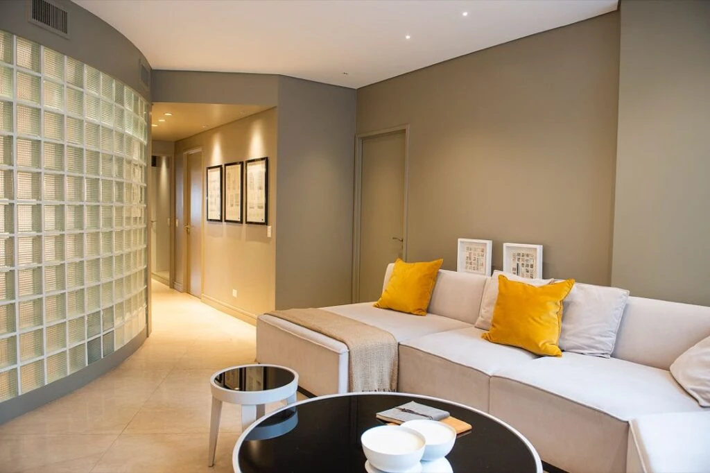 Una paleta de tonos neutros, con toques de un amarillo vibrante combinado con blanco, homologa los interiores de este departamento.