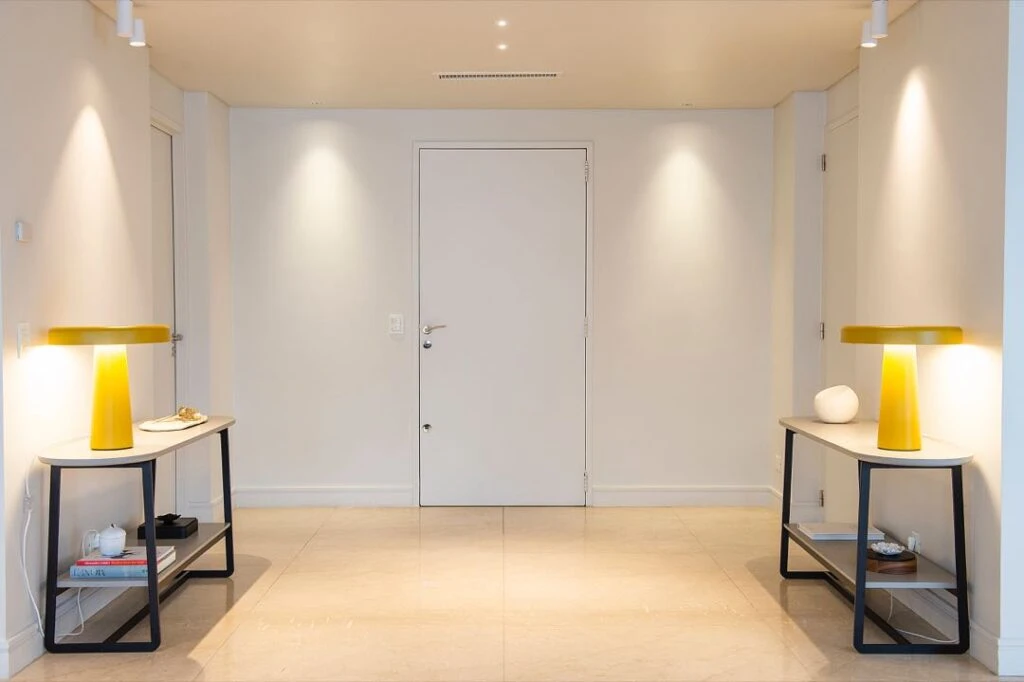 El amplio y despojado hall de entrada, ubica dos consolas combinadas (tienda fCH) con el acento de color en las lámparas de mesa, otro diseño característico de Federico Churba.