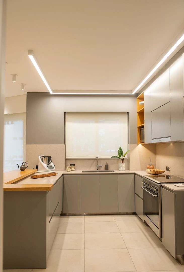 Las alacenas con herrajes ocultos generan una sensación de continuidad. Bandeja de madera maciza natural (Quintana Casa). Maceta de vidrio esmaltada con planta y dispenser en piedra grey (La Buhardilla).