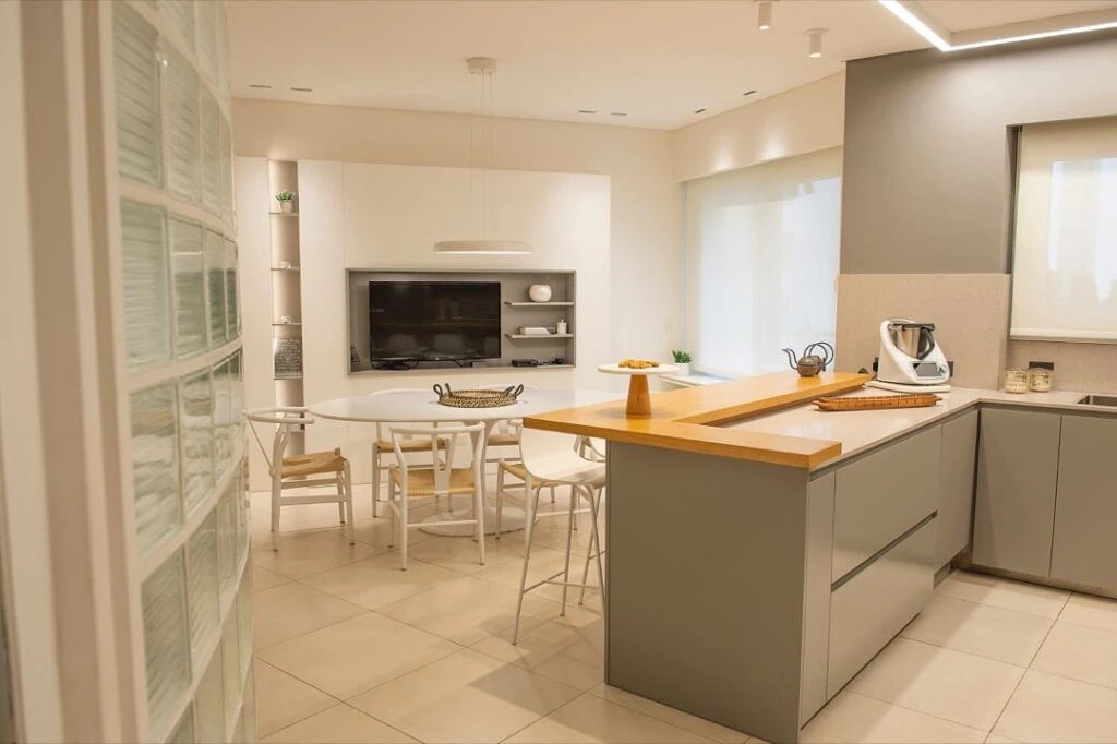 Una amplia cocina de diseño moderno, con una barra en madera de roble para integrar el espacio, acompañada por cuatro banquetas (Newton).