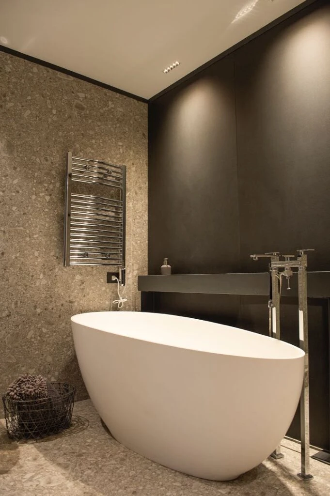 Las paredes están revestidas de terrazzo, en combinación con el piso y en placas de Laminan italiano Nero, material que se repite el frente del vanitory, su mesada y cajones.