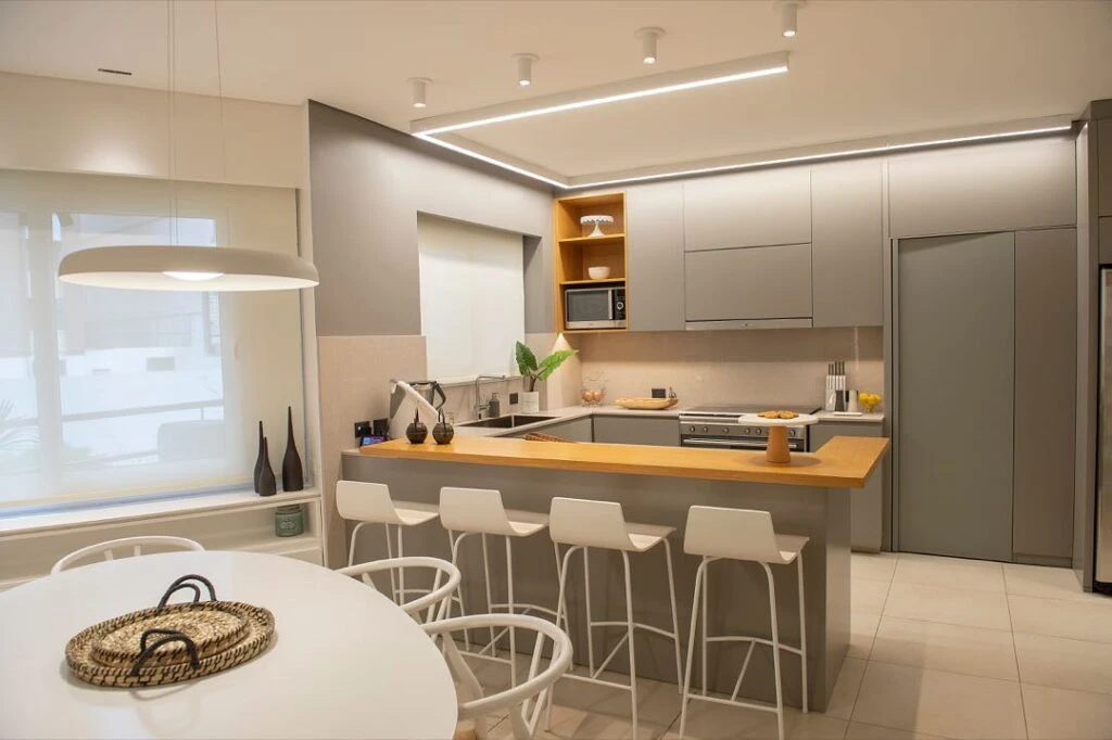 Una amplia cocina de diseño moderno, con una barra en madera de roble para integrar el espacio, acompañada por cuatro banquetas (Newton).