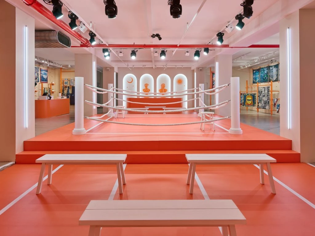 Con el naranja y el rosa como protagonistas presentes en paredes y suelos, está iluminado de una manera brillante y rodeado por los exclusivos diseños de la marca, los cuales también se hacen presentes en las bolsas de boxeo y en las mancuernas.