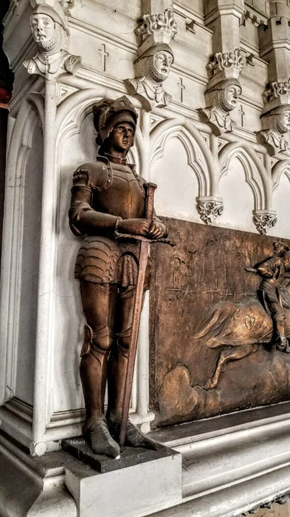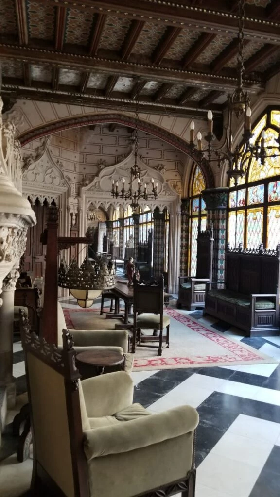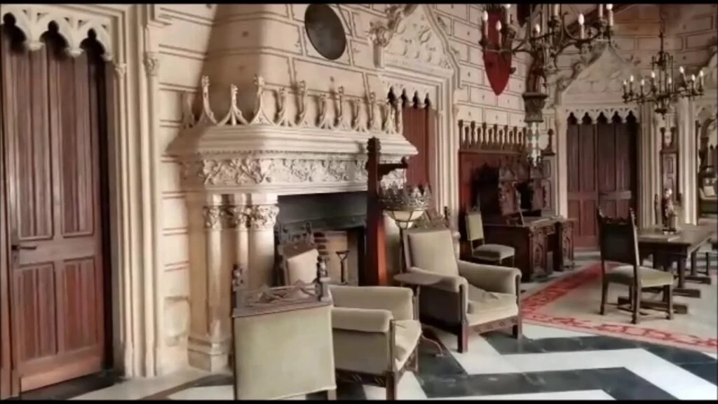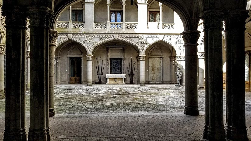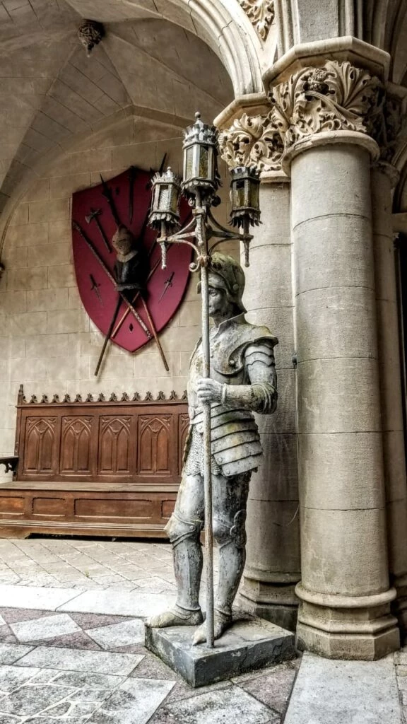 Con el tiempo, el castillo se pobló de piezas y detalles artísticos que parecían dominarlo todo. Con armaduras, escenas del Vía Crucis en relieve, vitrales con escenas bíblicas, hachas con iconografía de cabezas de dragón, grandes y pesadas gárgolas sobre el tejado que desagotaban el agua de las lluvias que regaban los campos.