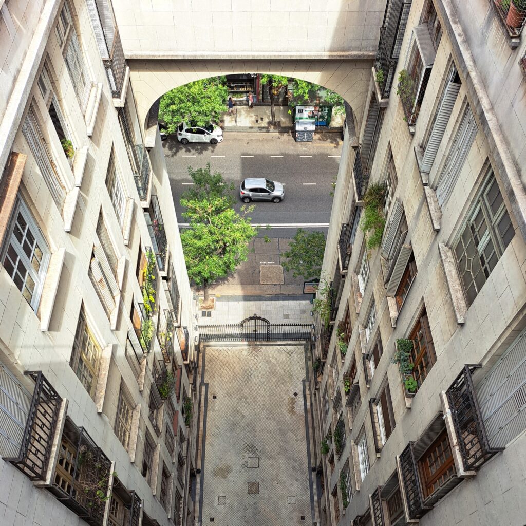 La incógnita se desata cuando me cuentan que el cuerpo del sexto piso, que conforma el icónico arco, está ocupado por habitaciones con balcón de medio punto a la calle y no oficia de puente porque no conecta ambos cuerpos. Sobre el mismo, los propietarios del séptimo piso ocupan una terraza con balaustradas que pertenece a cada uno de los dos departamentos. Al frente, el exterior del conocido arco simula un puente, pero no comunica los cuerpos de este. Jerarquiza el conjunto un balcón galería de cuatro arcos sostenidos por la continuidad de columnas circulares.
