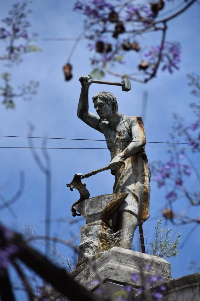 Remata la construcción una escultura con el forjador, ilustrando la actividad industrial que se gestaba en su interior. "El forjador" un símbolo figurativo dominando la escena, que se encuentra en lo alto coronando el edificio. Se trata de la figura de un trabajador del hierro, dando forma a una pieza de metal, empuñando con fuerza un martillo. La escultura retrata la acción de moldear el metal mediante el impacto del golpe que se remata sobre un yunque, al pie del experimentado forjador.