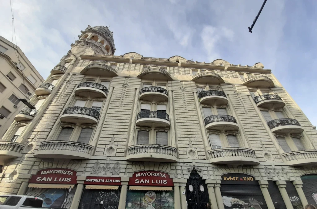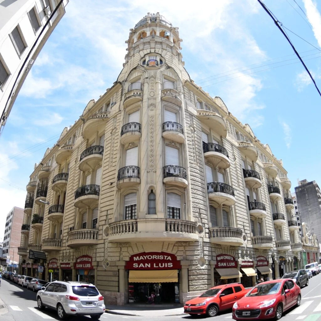 Revestido en símil piedra y concebido por su dueño como edificio para alquiler de locales comerciales en la planta baja y cinco pisos para viviendas y una opción de gran hotel que no se llevó a cabo, ocupa la esquina sureste de las calles Sarmiento y San Luis, y fue construido en el año 1916 bajo la dirección de Luis B. Laporte.