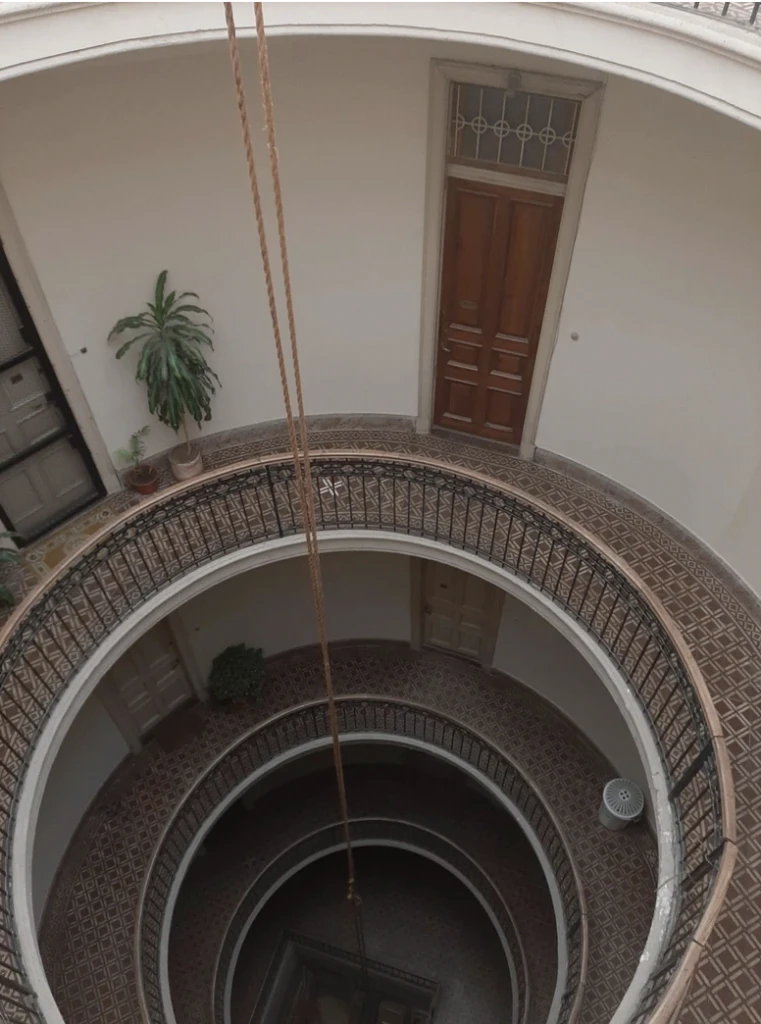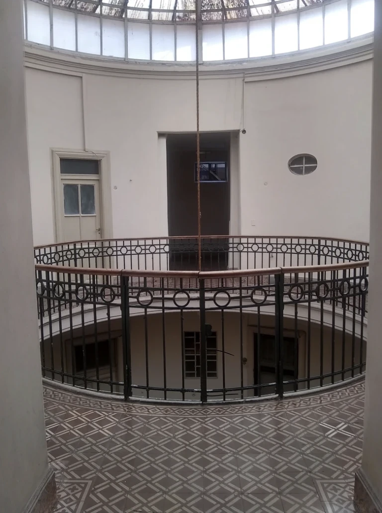 El hall de ingreso que está ubicado en la fachada norte y contiene una escalera semicircular que vincula los departamentos de mayor jerarquía y mayor tamaño. La fachada presenta un basamento claramente definido, jerarquizándose la esquina por la presencia de un volumen cilíndrico de mayor altura donde se asienta la famosa cúpula apuntada.