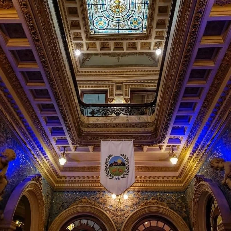 Un gran vitreaux cenital derrama un baño de luz sobre los querubines que cuidan el ingreso. La residencia cuenta con veinte ambientes, se suceden salas con delicados vitraux, guardas con motivos de dragones y pasillos estucados en varias tonalidades de mármol. Sobre las dos consolas, los espejos guardan el recuerdo de los gobelinos que el mismo Colombo pintó y que solían exaltar el recibidor del hall de la casa. Lucen adentro, bellos y refinados pisos de madera en mosaicos y marquetería. La particular y distinguida iluminaria, que algunos verán como forma de sombrero, también aparece en la famosa panadería Bologna.