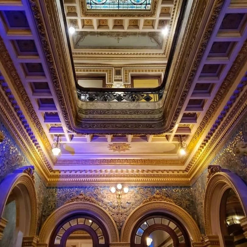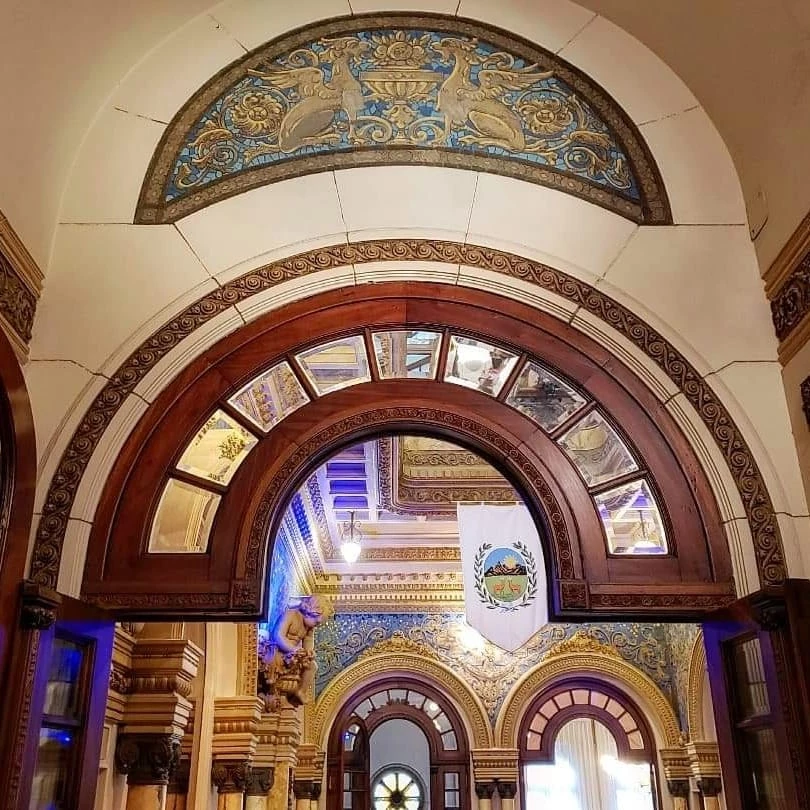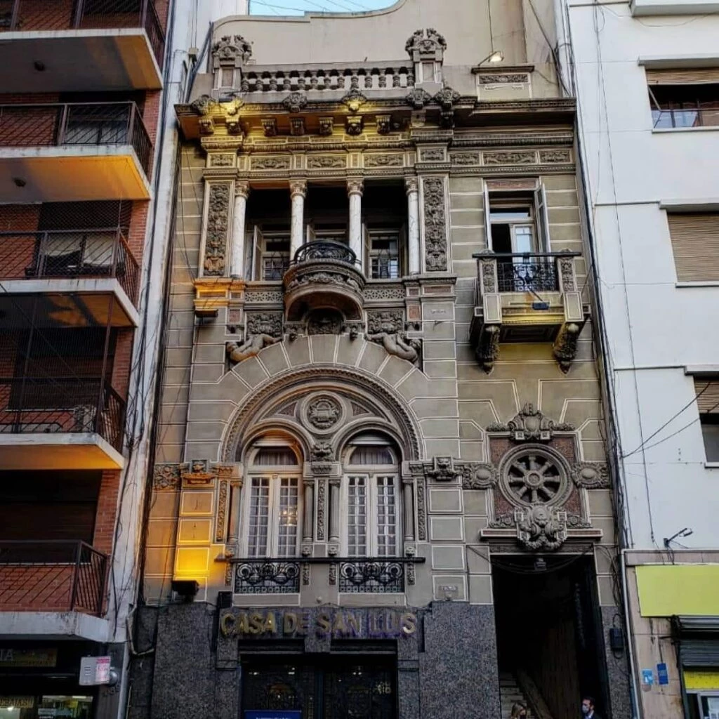 Afuera, aunque su altura ha quedado baja para la línea del frente urbano de los tiempos que corren, sus balcones, las filigranas superpuestas, los orgánicos herrajes y las figuras de piedra obligan a alzar la mirada de quienes pasan profundizando en los detalles. Sobre la puerta de hierro, un ventanal con vitraux y una suerte de timón, pavos y querubines, cabezas de dragones embelleciendo los desagües y copones con elementos de la naturaleza enriquecen la fachada.