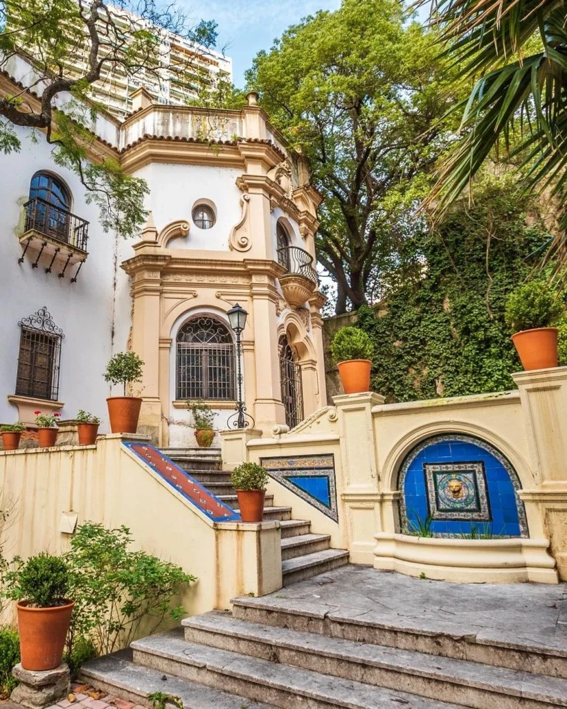 Sumido en el silencio, ingresar al Palacio Noel propicia la abstracción a un estado fuera del tiempo. Un jardín de olivos, ombúes, palos borrachos, algunos cítricos y flores de malvones, jazmines y rosales dialogan con la centenaria enredadera en sacra comunión.