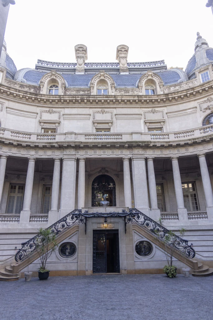 Las líneas de sus bocetos combinan el clasicismo con el art Nouveau para la creación de este “hôtel particulier” parisino. En favor del vocabulario clásico, sus pilastras, molduras y ornamentos, y la mansarda que corona el edificio, con sus techos de pizarra y ojos de buey, son características de la arquitectura francesa de la época, amada por la elite porteña de entonces. Tres residencias, un palacio sobre el terreno limitado por las calles Basavilbaso, Arenales y Esmeralda.
